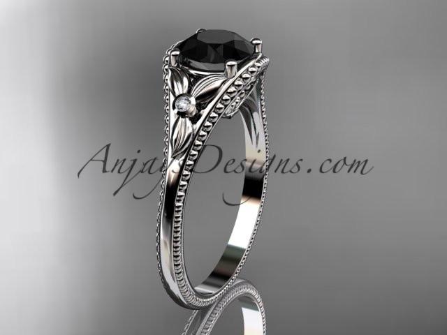 14k white gold leaf and flower diamond unique engagement ring with a Black Diamonde center stone ADLR377