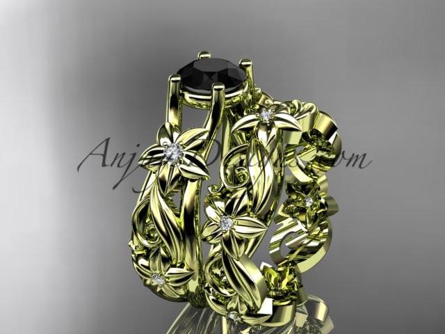 14k yellow gold diamond floral wedding set, engagement set with a Black Diamond center stone ADLR216S