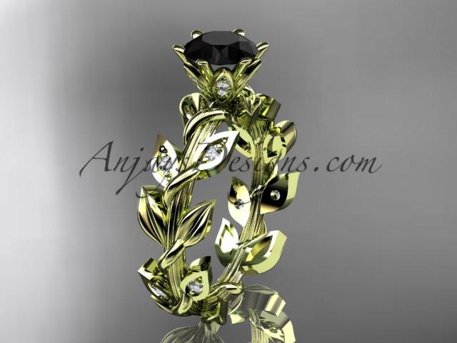 14k yellow gold diamond leaf and vine engagement ring with a Black Diamond center stone ADLR124