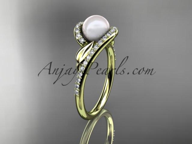 14k yellow gold diamond leaf and vine, pearl wedding ring, engagement ring AP317
