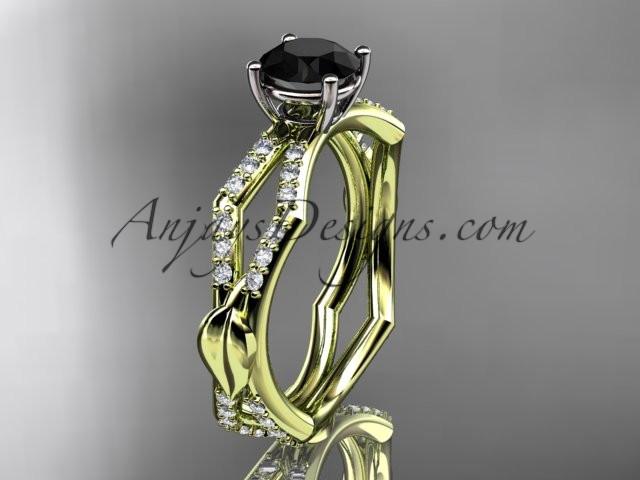 14k yellow gold diamond leaf and vine wedding ring,engagement ring with a Black Diamond center stone ADLR353