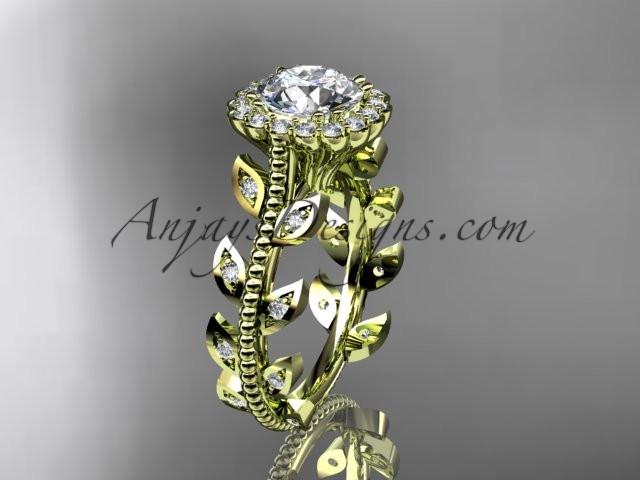 14k yellow gold diamond leaf and vine wedding ring, engagement ring with a "Forever One" Moissanite center stone ADLR118