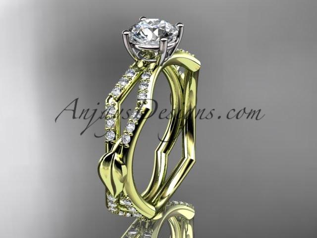 14k yellow gold diamond leaf and vine wedding ring,engagement ring with a "Forever One" Moissanite center stone ADLR353