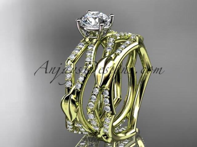 14k yellow gold diamond leaf and vine wedding ring, engagement set ADLR353S