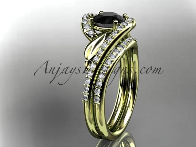 14k yellow gold diamond leaf and vine wedding ring, engagement set with a Black Diamond center stone ADLR317S