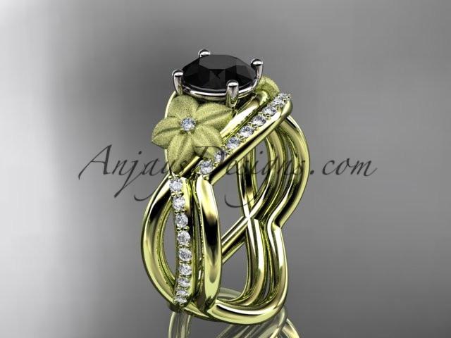 14k yellow gold diamond leaf and vine wedding ring, engagement set with a Black Diamond center stone ADLR90S