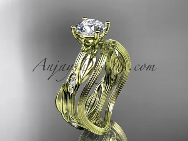 14k yellow gold diamond leaf and vine wedding ring set, engagement ring set ADLR31S with "Forever One" Moissanite center stone