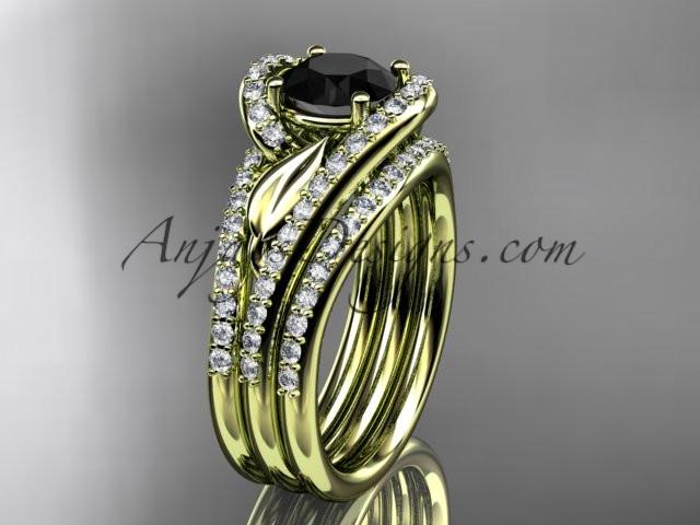 14k yellow gold diamond leaf wedding ring with a Black Diamond Moissanite center stone and double matching band ADLR317S