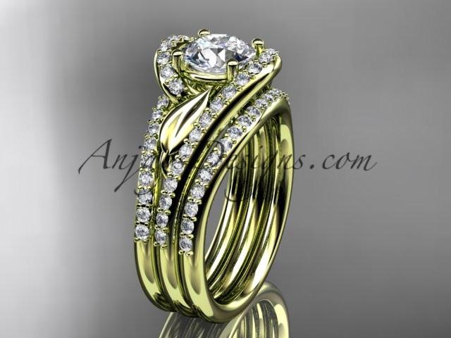 14k yellow gold diamond leaf wedding ring with a "Forever One" Moissanite center stone and double matching band ADLR317S