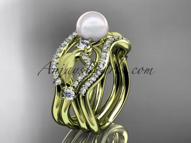 14k yellow gold diamond pearl leaf engagement ring with double matching band AP68S