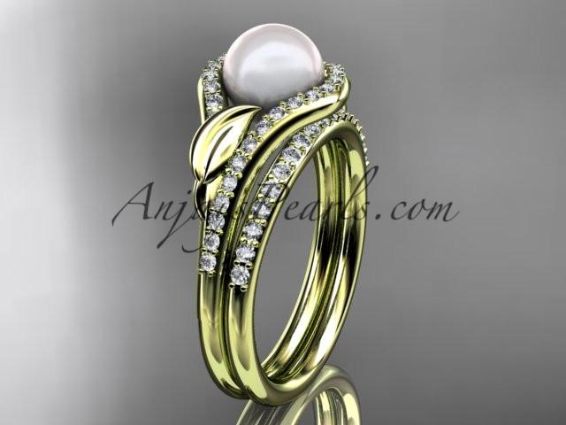 14k yellow gold diamond pearl leaf engagement ring set AP334S