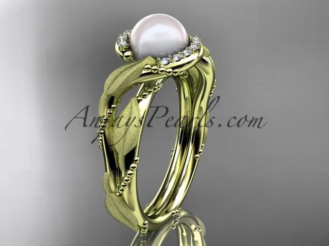 14k yellow gold diamond pearl vine and leaf engagement ring AP65