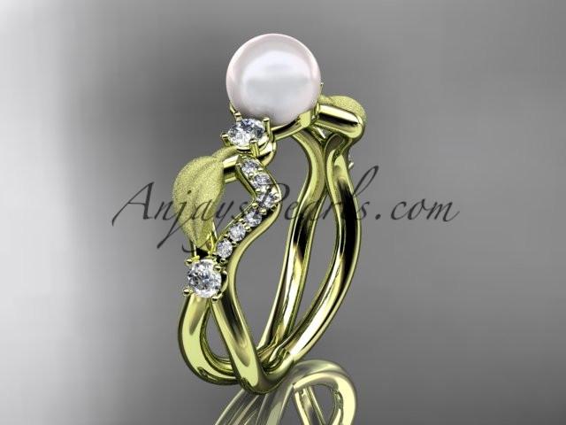 14k yellow gold diamond pearl vine and leaf engagement ring AP68