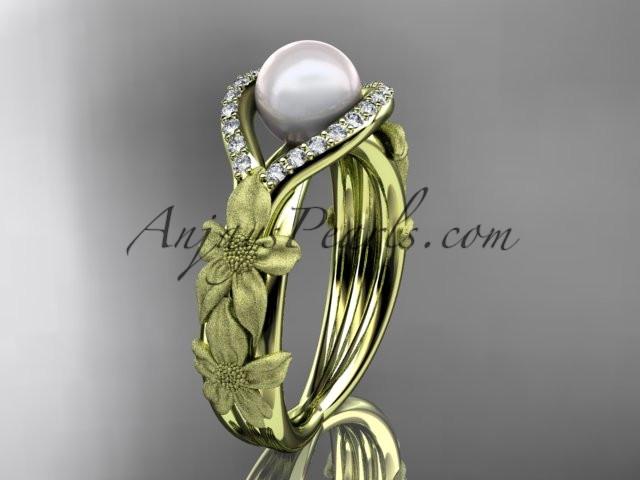 14k yellow gold diamond pearl vine and leaf engagement ring AP85