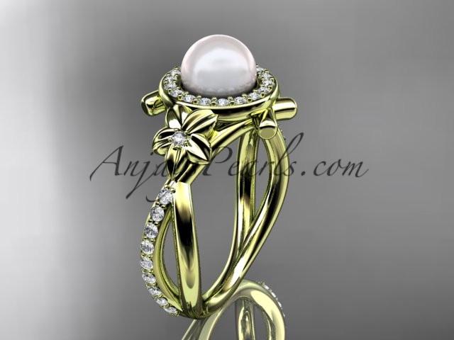 14k yellow gold diamond pearl vine and leaf engagement ring AP89