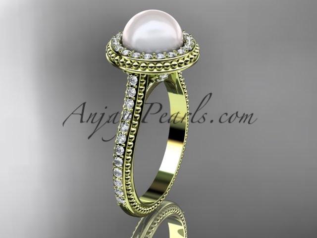 14k yellow gold diamond pearl vine and leaf engagement ring AP97