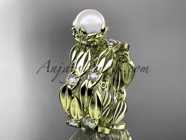 14k yellow gold diamond pearl vine and leaf engagement set AP58S