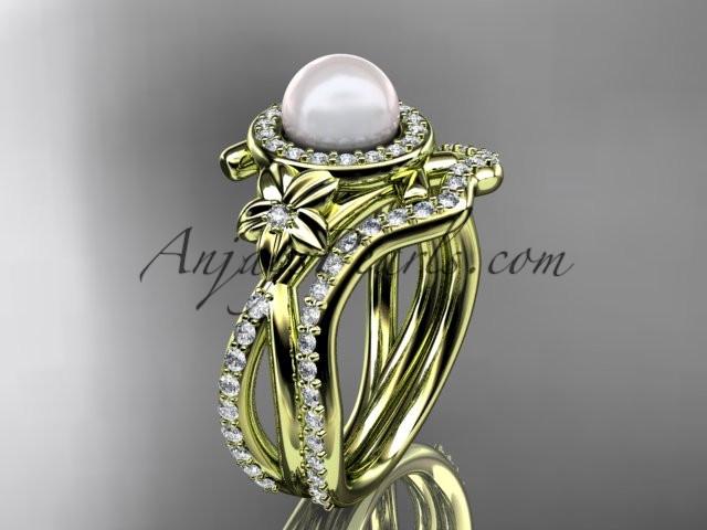 14k yellow gold diamond pearl vine and leaf engagement set AP89S