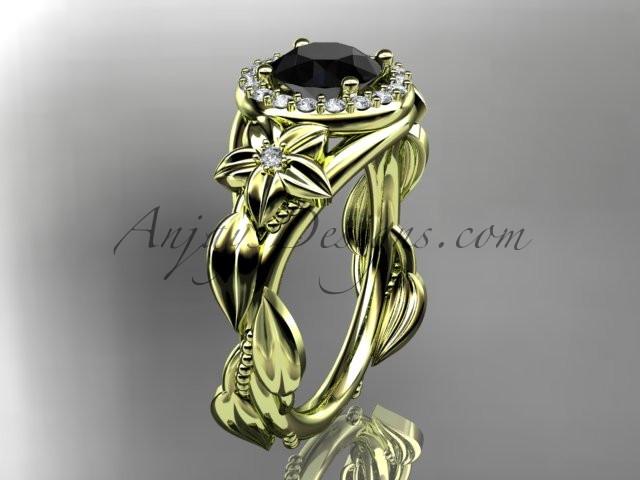 14k yellow gold diamond unique leaf and vine, floral engagement ring with a Black Diamond center stone ADLR327