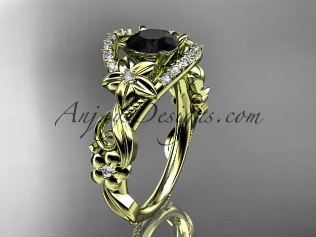 14k yellow gold flower diamond unique engagement ring with a Black Diamond center stone ADLR211