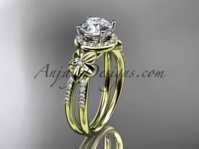 14k yellow gold leaf and flower diamond unique engagement ring, wedding ring with a "Forever One" Moissanite center stone ADLR373