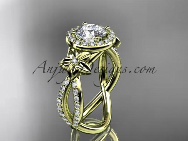 14k yellow gold leaf and flower diamond unique engagement ring, wedding ring with a "Forever One" Moissanite center stone ADLR374