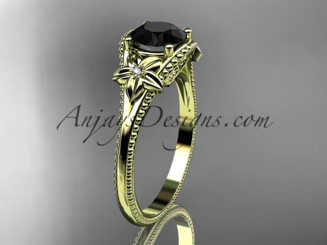 14k yellow gold leaf and flower diamond unique engagement ring with a Black Diamonde center stone ADLR375