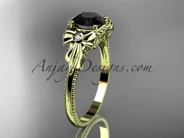 14k yellow gold leaf and flower diamond unique engagement ring with a Black Diamonde center stone ADLR376