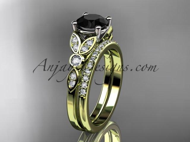 14k yellow gold unique engagement set, wedding ring with a Black Diamond center stone ADLR387S