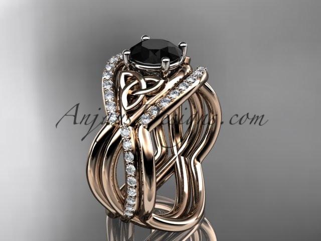 14kt rose gold celtic trinity knot engagement ring, wedding ring with a Black Diamond center stone and double matching band CT790S