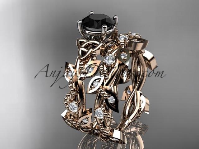 14kt rose gold celtic trinity knot engagement set, wedding ring with a Black Diamond center stone CT759S