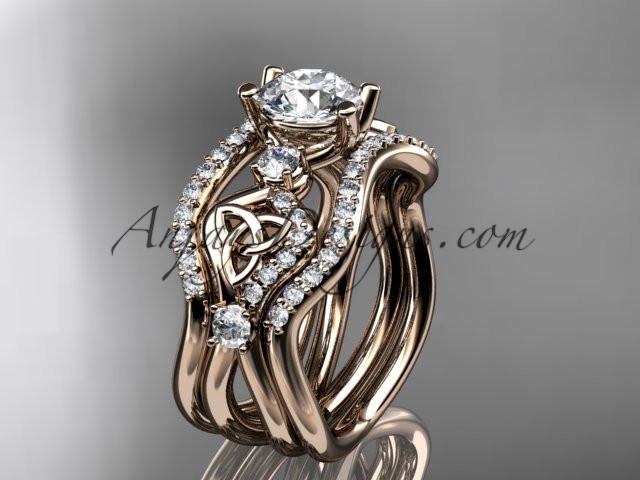 14kt rose gold celtic trinity knot engagement ring, wedding ring with a "Forever One" Moissanite center stone and double matching band CT768S
