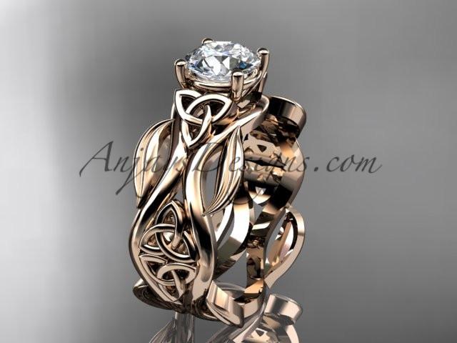 14kt rose gold celtic trinity knot wedding ring, engagement ring with a "Forever One" Moissanite center stone CT7264