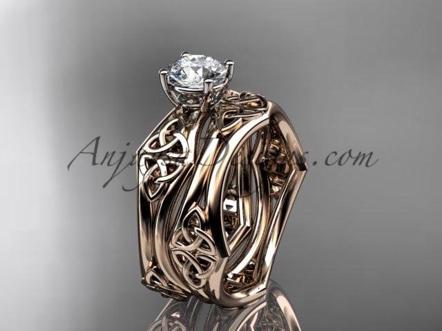 14kt rose gold celtic trinity ring, triquetra ring, engagement set with a "Forever One" Moissanite center stone CT7356S