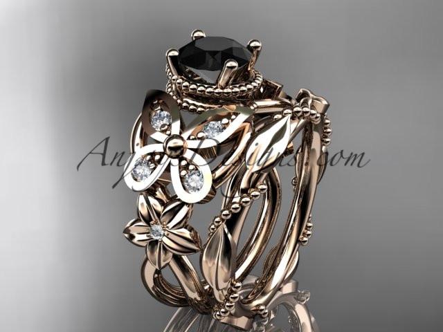 14kt rose gold diamond floral, butterfly wedding ring, engagement set with a Black Diamond center stone ADLR136S