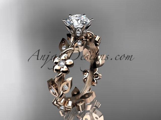 14kt rose gold diamond leaf and vine engagement ring with a "Forever One" Moissanite center stone ADLR209
