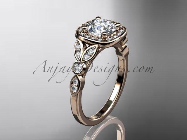 14kt rose gold diamond leaf and vine wedding ring, engagement ring with a "Forever One" Moissanite center stone ADLR179