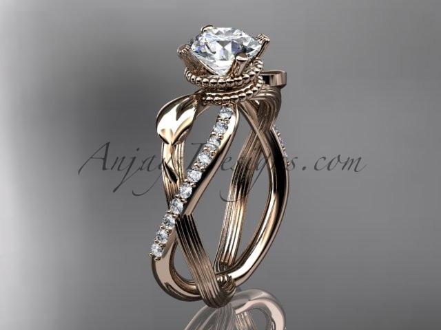 14kt rose gold diamond leaf and vine wedding ring, engagement ring with "Forever One" Moissanite center stone ADLR70