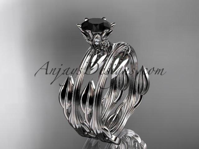 platinum leaf and vine wedding ring, engagement set with a Black Diamond center stone ADLR343S - AnjaysDesigns