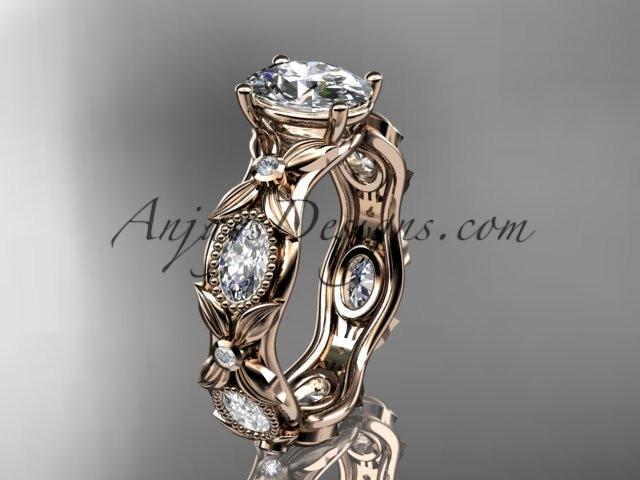 14kt rose gold diamond leaf and vine wedding ring, engagement ring with a "Forever One" Moissanite center stone ADLR152