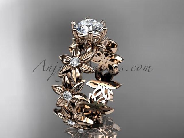 Unique 14k rose gold diamond floral engagement ring with a "Forever One" Moissanite center stone ADLR339