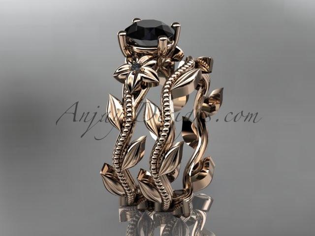 Unique 14k rose gold diamond floral wedding ring, engagement set with a Black Diamond center stone ADLR238S