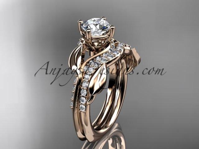 Unique 14k rose gold diamond leaf wedding ring, engagement set ADLR225S