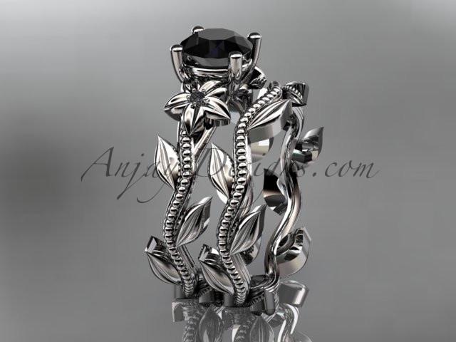 Unique 14k white gold diamond floral wedding ring, engagement set with a Black Diamond center stone ADLR238S