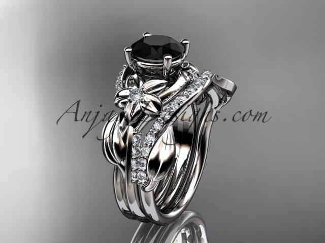 Unique 14k white gold diamond flower, leaf and vine wedding ring, engagement set with a Black Diamond center stone ADLR224S