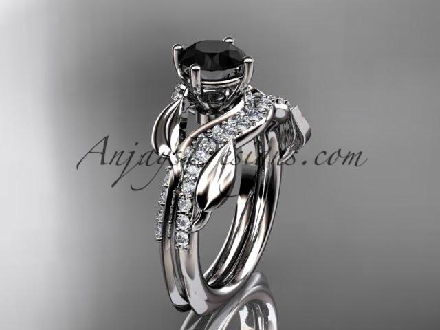 Unique 14k white gold diamond leaf wedding ring, engagement set with a Black Diamond center stone ADLR225S