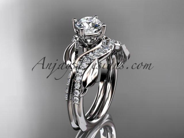 Unique 14k white gold diamond leaf wedding ring, engagement set with a "Forever One" Moissanite center stone ADLR225S
