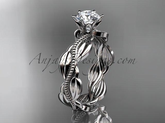 Unique 14k white gold leaf and vine engagement ring, wedding band with a "Forever One" Moissanite center stone ADLR258