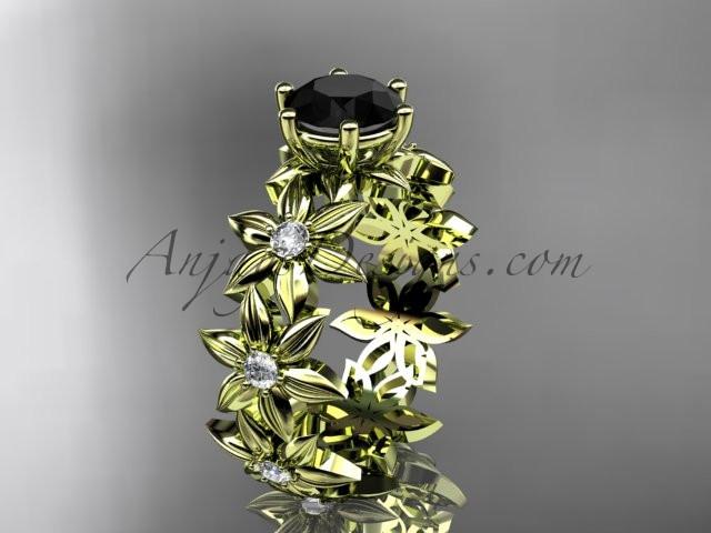 Unique 14k yellow gold diamond floral engagement ring with a Black Diamond center stone ADLR339