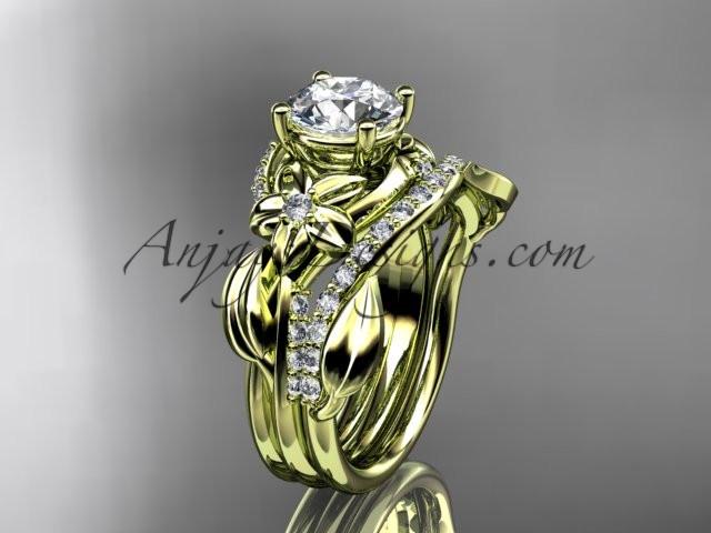 Unique 14k yellow gold diamond flower, leaf and vine wedding ring, engagement set with a "Forever One" Moissanite center stone ADLR224S
